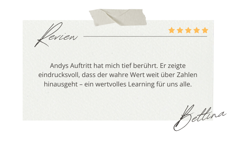 Genau hier öffne ich Räume: nicht mit trockenen Bilanzen, sondern mit Geschichten, die bewegen. Mit Bildern, die unter die Haut gehen. Und mit Impulsen, die uns erinnern, dass Erfolg weit mehr ist als das, was wir auf den ersten Blick sehen.